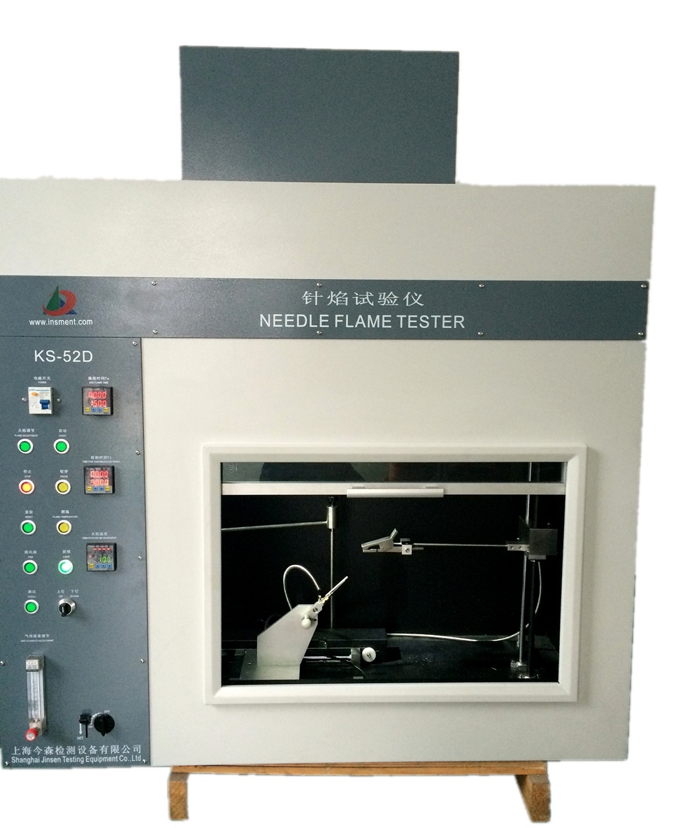 针焰试验仪是用规定尺寸 (Φ0.9mm ) 的针状燃烧器,通以特定燃气 ( 丁烷或丙烷 ) ,以 45° 角定时定向施燃试品,视试品及引燃铺垫层是否引燃及持燃时间和燃烧长度来评定设备内部因故障条件造成的小火焰的着火危险性。